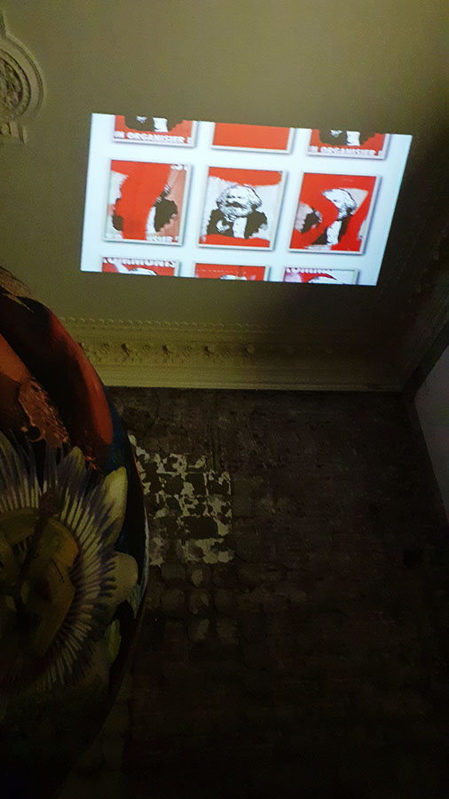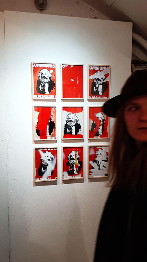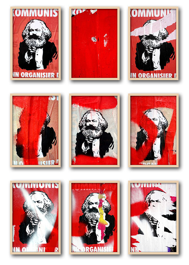 »Karl Marx« hängt an jeder Ecke. Sein holzschnittartig vereinfachtes Gesicht ist zur Ikone geworden. Verschmolzen mit dem ebenfalls ikonischen Bild von »Uncle Sam« wird er in Serie plakatiert. Besprüht, zerfetzt und abgerissen werden die Plakate selbst zum Objekt und Symbol der Auseinandersetzung um seine Philosophie.