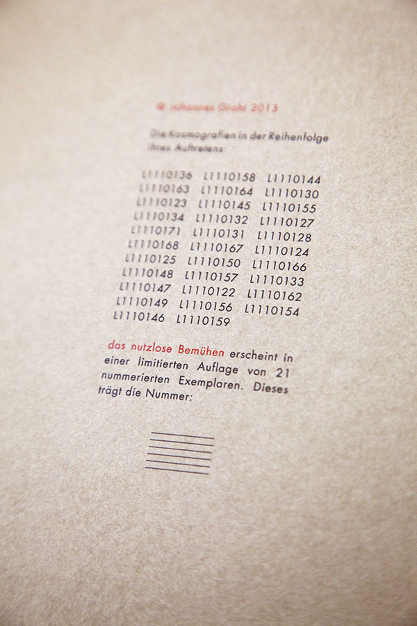 Als »Kosmografien« bezeichne ich Fotografien von gefundenen Oberflächen, deren Struktur sich den kosmischen Einflüssen des Zufalls und der Erosion verdankt (griechisch »kósmos«: Weltall, Ordnung; »gráphein«: Beschreibung, Zeichnung).