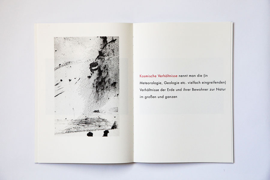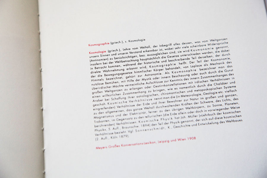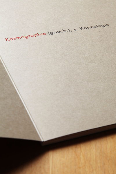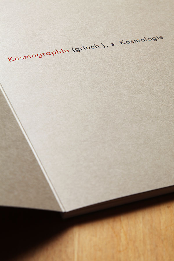 Die Auseinandersetzung mit dem Begriff »Kosmografie« wird zum Anlass, einen alten Lexikon-Eintrag mit Kosmografien zu illustrieren. Dabei bekommen die Bilder genau die Bedeutung, die ihnen der Text eigentlich abspricht.