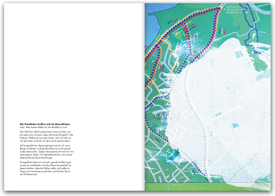 Von 2016 bis 2023 verbrachten meine Tochter und ich jedes Jahr ein paar Tage auf einem Ponyhof in der Probstei, einer Halbinsel östlich von Laboe an der Kieler Förde in Schleswig-Holstein. Während sie reiten lernte, sah ich mich um – auf dem Hof, im Dorf, auf dem Land und am Meer. Auf ausgedehnten Spaziergängen konnte ich neue Dinge entdecken und bereits bekannte noch einmal anders betrachten. Dabei interessierte ich mich für ihre verborgenen Seiten, für abstrakte Muster und andere überraschende Zusammenhänge. Fotografisch habe ich versucht, gewohnte Deutungsmuster zu unterlaufen und das Bekannte poetisch zu überschreiben.